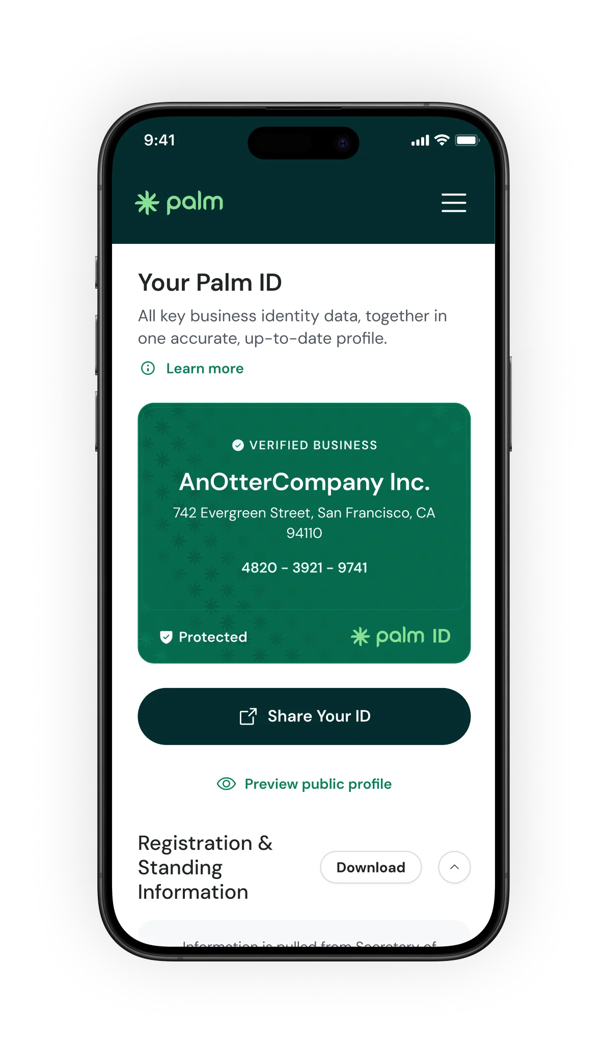 Share your business identity with confidence. From banks and credit providers to government agencies, Palm lets you safely syndicate your verified identity anywhere you do business. No more re-entering forms and proving yourself again.